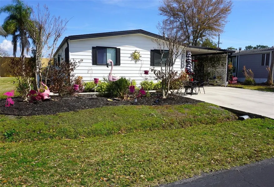 Updated Single-Family home located in the gated nudist/clothing-optional community of Paradise Lakes. Open concept split bedroom floorplan with neutral colors and wood laminate flooring throughout. The remodeled kitchen features newer cabinets, granite counters, smooth-top induction range, 3-door refrigerator, dishwasher, disposal, built-in microwave, and breakfast bar. Spacious primary ensuite bedroom with granite top vanity, walk-in shower, linen storage, and walk-in closet. Two secondary bedrooms with mirror closet doors are ideal for guests or an office. Full second bath with granite vanity top and tub/shower combination. Light and bright living room is ideal for entertaining. Spread out in the enclosed 264 sq ft flex/bonus room with new frames/screens, bar, and plumbed exhaust heating/cooling unit. New AC in 2025, newer roof, plumbing, appliances, flooring. This lovely home has an electric/solar hybrid water heater, attached shed/workshop with tons of extra storage, grassy fenced yard with paver patio, garden beds, and water softener system. Inside laundry room with full-size washer/dryer. Off-street parking with concrete driveway and covered carport. Buyer is responsible for verifying all information, details and dimensions. Condo association approval of Buyer is required including application, fee, background check, orientation, and membership in a recognized nudist organization. Optional membership to Paradise Lakes Resort is not included in monthly condo association fee.