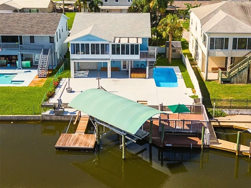 One or more photo(s) has been virtually staged. Experience the ultimate Florida Coastal Living, boating, fishing and relaxing lifestyle in this alluring waterfront stilt home, designed to offer ambiance, convenience, affordability and peace of mind. This beautiful waterfront pool home features 2 bedrooms and 2 bathrooms upstairs, with an additional 1 bedroom and 1 bathroom downstairs. Featuring a large dock, a floating dock, as well as a covered 10,000-pound lift, this property is a dream for saltwater enthusiasts. On the second level, the main living area,, you'll love the open and airy atmosphere, enhanced by abundant natural light from lofted and rear windows offering stunning canal views. This level includes a well-appointed kitchen with a center island, a spacious living room, a delightful sunroom, a guest bedroom, and a guest bathroom. The primary bedroom suite and bath add a littl...