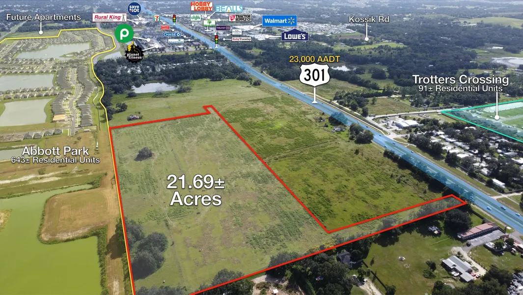 LOCATION DESCRIPTION - The site sits within Zephyrhills fast-growing residential corridor, surrounded by new and planned communities. Adjacent to the east is Abbott Park, planned for a total of 643 homes, and across the street is Trotters Crossing, a 91-unit build-to-rent community. Additional residential growth continues along Gall Boulevard and Eiland Boulevard, positioning the property in the path of ongoing development and within easy reach of Zephyrhills amenities and the SR 54/56 corridor. Within one mile of major retailers such as Publix, Walmart Supercenter, Lowes Home Improvement.