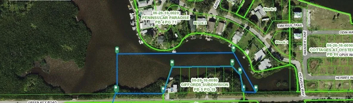 Legal description as county site: AT SE COR OF NE1/4 OF SEC TH ALG S BDY OF NE1/4 OF SEC S89DEG46' 57"W 1488.42 FT TH N29DEG06' 15"W 57.11 FT TO N R/W LINE OF GREEN KEY RD FOR POB TH ALG SAID N R/W LINE S89DEG46' 57"W 802.41 FT TH N00DEG13' 03"W 230 FT TH N89DG 46' 57"E 675.52 FT TH S29DEG 06'15"E 262.68 FT (Q1) TO POB; EXC THAT PART (LOTS 1 THRU 8 INCL) OF GIFFORD'S SUBDIVISION PB 5 PG 19 LYING THEREIN