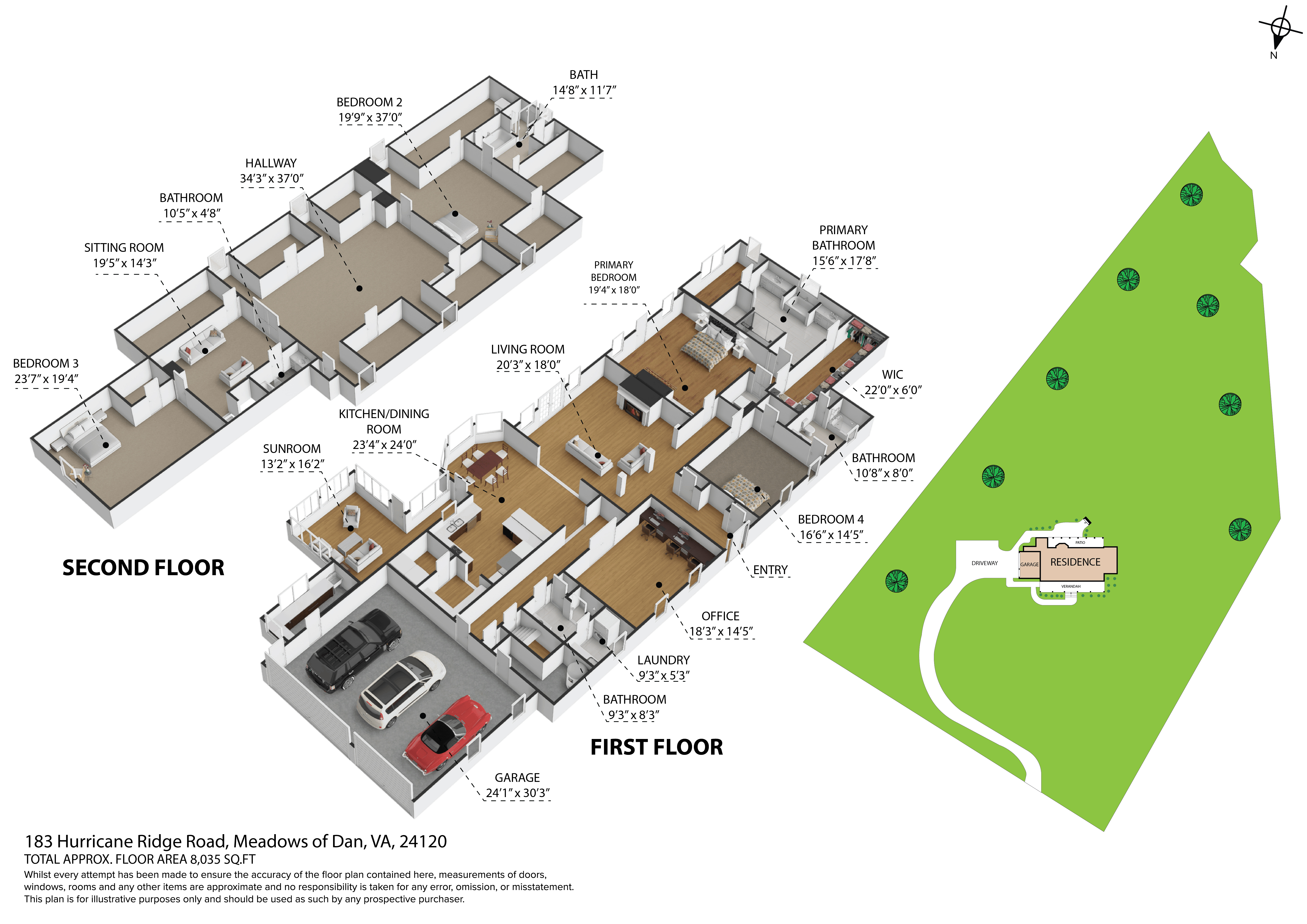 Experience refined mountain living in this extraordinary 6,201 sq ft estate in the heart of Meadows of Dan, VA. Nestled on 3.98 acres and adjoining protected Blue Ridge Parkway land, this mansion offers privacy and elegance just 4 miles from the iconic Mabry Mill, 3 miles from Nancys Candy, and only 10 miles from world-class Primland Resort. Meadows of Dan is a vibrant yet peaceful community, where fresh mountain air, scenic parkway views, and a slower pace of life meet modern convenience. Within 2 hours youll reach Roanoke, Winston-Salem, Greensboro, and Charlotte, all with major airports, cultural attractions, and shopping. Designed with comfort and accessibility in mind, the home features a handicap-accessible layout, 10 ft ceilings, custom moldings, and expansive living spaces ideal for entertaining. A sweeping front porch welcomes you, while the grand back patio with stone fireplace sets the stage for outdoor gatherings. The gourmet kitchen includes double ovens, custom cabinetry, a butlers pantry, and sunny solarium, opening into the elegant living area with fireplace and access to covered outdoor living. The main-level master suite spans nearly 1,000 sq ft, with fireplace, private outdoor access, fitness/office/tanning room, luxury bath with tiled shower, jetted tub, walk-through closet, and private laundry. Guest suites, a custom library, 3rd full bath, and 3-car garage with workshop complete the main floor. Upstairs offers 9' ceilings, 2 additional bedroom suites, a spacious living/dining/work area, 3rd laundry, and abundant storage. Extras include: 3-zone HVAC, whole-house generator, dual water heaters, security system, an additional 1,000 sf garage, and crushed marble drive. Surrounded by open lawn and wooded privacy, this is a rare chance to own a true Blue Ridge Parkway estate.