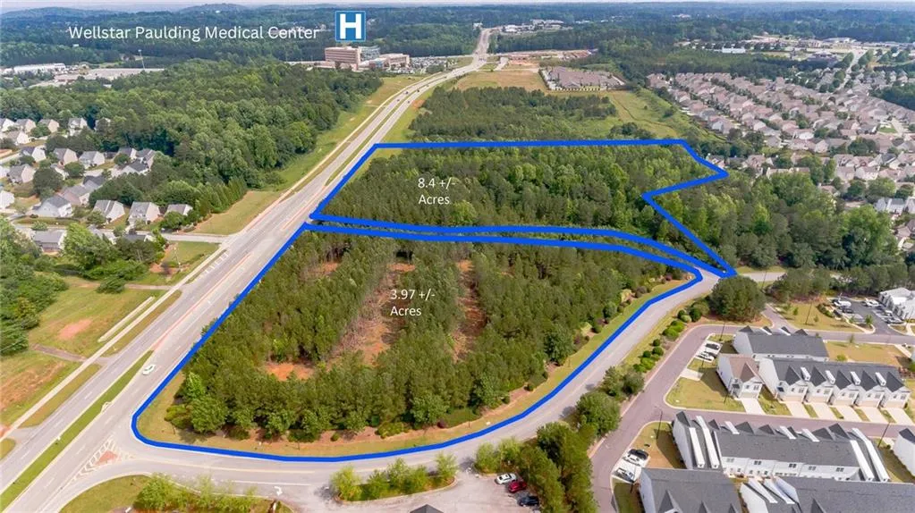 Two parcels of commercial land on Bill Carruth Pkwy in Hiram near the WellStar Paulding Medical Center totaling 12.37+/- combined acres. Individual parcels are 8.4 acres and 3.97 acres, and can be sold separately or together. Excellent location for Medical Office. Currently zoned B-2 for general commercial uses. Sewer is available.