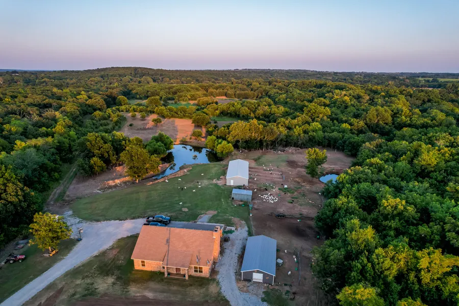 Nestled down a dead end road lies this very private, secluded property on 30 +/- acres. With a gated entrance, the property consists of rolling landscape with wooded areas, food plot for wildlife, two barns, storm cellar, a large stocked pond, and more! The largest barn is a 26 x 70 x 9 with 5 roll-up doors and 1 walk-through door. Completed with spray foam throughout. The smaller barn is 20 by 40 with one roll-up door and 1 walk-through. Built in 2008, this brick 2000 sqft (courthouse) home has 3 bedrooms and 2 baths equipped with a modern features. Home offers spacious open-concept kitchen and living room with 20 foot ceilings and a wood burning fireplace perfect for family gatherings. Granite countertops throughout the home, stained concrete floors, and much more. Covered patio with gorgeous view. With the abundant wildlife, you'll enjoy the large bass, turkey, hogs, and some of the largest deer in Oklahoma. Can be combined purchased with MLS#2430812