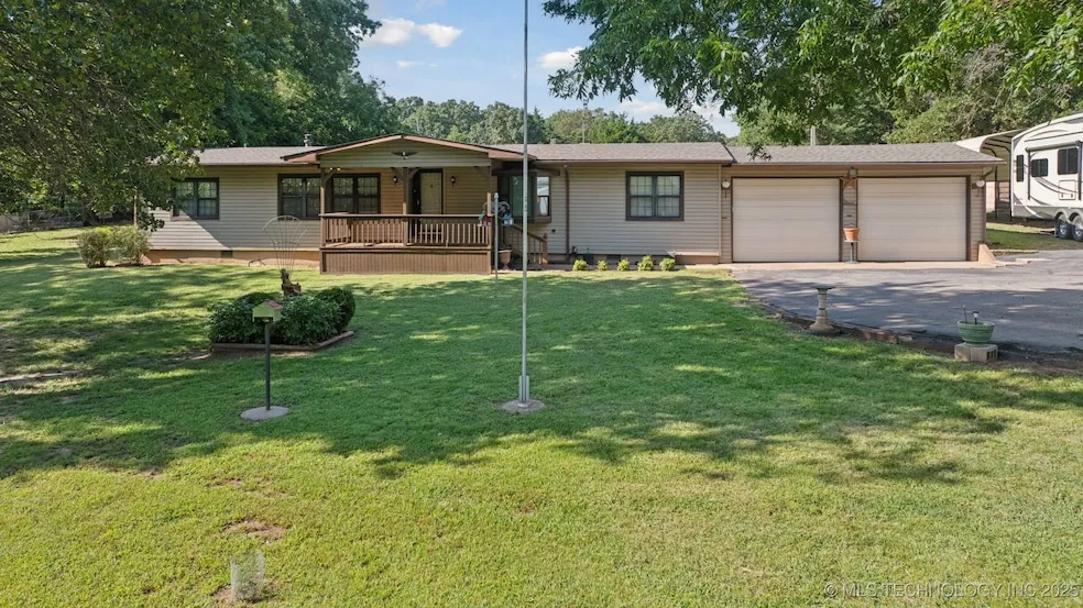 Set on just under 2 acres, this well-cared-for property offers the perfect blend of space, comfort, and opportunity. From the welcoming covered front porch to the oversized back patio, there's room to relax and enjoy both indoor and outdoor living. Inside, you'll find a spacious layout with multiple living and dining areas, including a 20x20 addition featuring vaulted ceilings, exposed beams, and a brick fireplace- ideal for family gatherings or entertaining. The kitchen offers abundant cabinetry, a breakfast bar, and great natural light, while the formal dining space is perfect for hosting meals. Bedrooms are generously sized, and the primary suite includes a large bath with double vanities, a walk-in shower, and ample storage. A second full bath, laundry room with cabinetry, and plenty of closet space add convenience. Outdoors, this property truly shines. A massive covered patio is perfect for entertaining, while mature trees provide shade and charm. Multiple outbuildings add flexible space for storage, workshops, or hobbies, and the storm cellar provides peace of mind. The oversized 2-car garage with workspace and double doors is ideal for projects, and there's even room for RV or boat parking with a covered area already in place. This home has been lovingly maintained and offers a solid foundation for personal touches and updates. Buyers will appreciate the opportunity to make it their own, whether through modern updates or keeping its original charm. With its size, layout, and land, this property is a rare find at this price point-perfect for those seeking both function and potential.