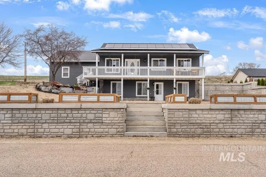 Country living on half an acre in a beautifully remodeled 4-bedroom, 3-bathroom, 2-car garage home. Situated on .56 acres in the country in New Plymouth, this gem includes FULL SOLAR power, resulting in a power bill under $175 per year. Entering off of the large, full-length deck, this open-concept living room is light, bright, and has vaulted ceilings that flow into the kitchen and dining areas. A spacious kitchen. The main level has new engineered hardwood floors throughout. The kitchen boasts an 8 ft island, a full tiled backsplash, a pantry with a barn door, plus all-new appliances. A sliding door takes you to the back patio, private backyard, and a hot tub! The main level Primary bedroom features a large walk-in closet and bathroom with a step-in shower. Downstairs, you'll find a second great room, 2 bedrooms, a large bathroom w/dual vanities, a lofty laundry room, & all-new carpet. 52 solar panels power the house, plus a 400 amp panel and wire trenched for a future shop location. Includes a chicken coop, multiple garden boxes, and extensive landscaping with retaining walls. The interior and exterior were freshly painted in 2024 and are fresh and ready for you. This property provides generous square footage in the home, and a large and manageable property size that allows you to live in the country with space from neighbors while easily maintaining the land. Call to view today!