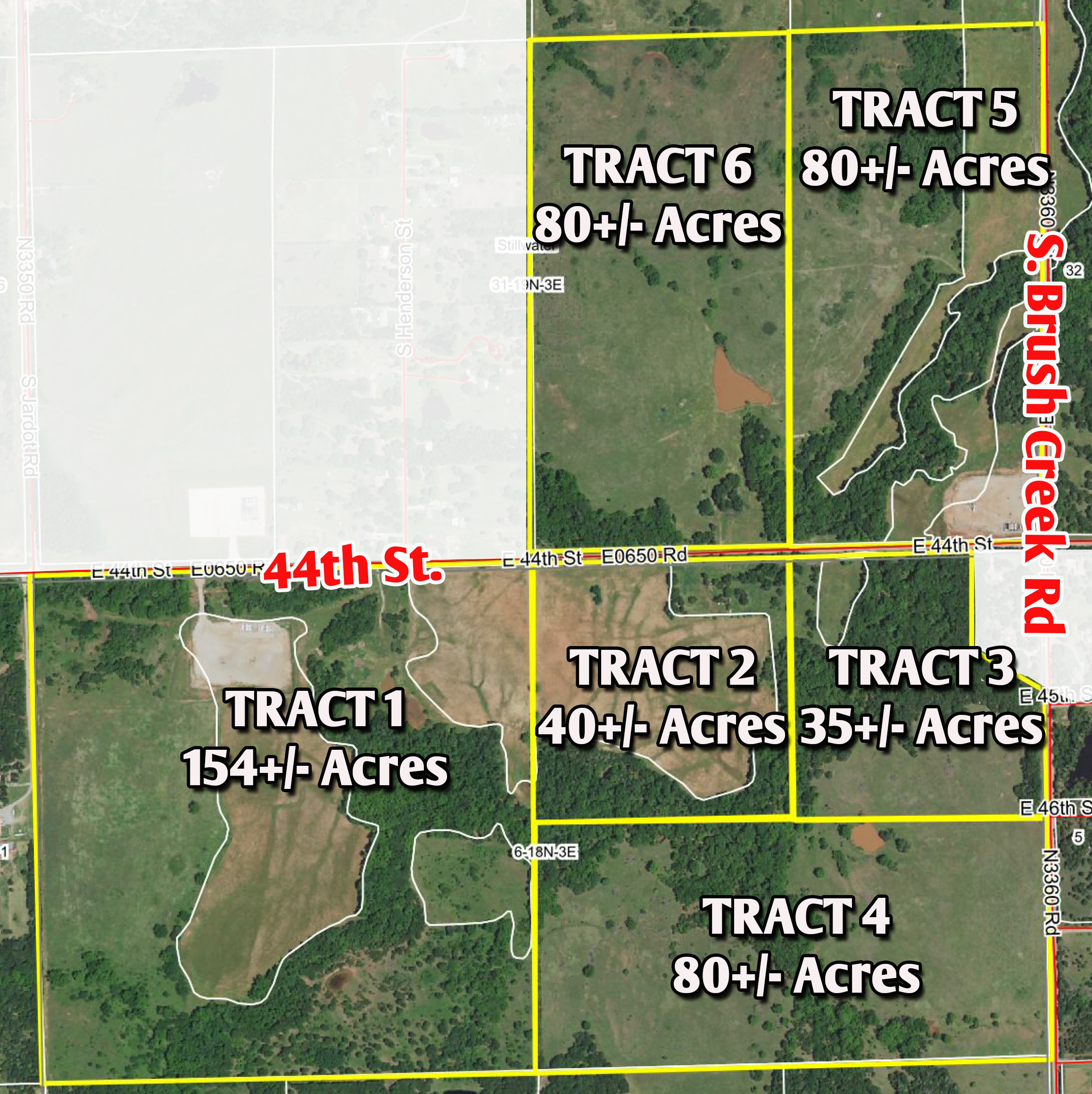 Tracts 1-6 Are located just south of Stillwater on 44th ST between Jardot and Brush Creek Roads-Hard surface road frontage on all Tracts with the exception of Tract 4-WATCH FOR SIGNS-Tracts are in Section 6-T18N-R3E and Section 31-T19N-R3E