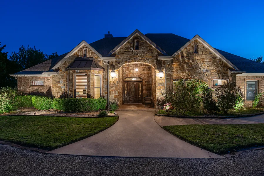 Featuring this Custom-built home that’s absolutely STUNNING. This exquisite property offers 3 Bed, plus a versatile Den/Study and 2.5 luxurious baths. NESTLED on a beautifully landscaped 3 acre (m/l) lot that’s extremely well maintained home and features Radiant Heated Oak Hardwood floors throughout that provides both warmth and elegance. The Upscale kitchen is a Chef’s dream, boasting top-of-the-line appliances, abundant granite countertops and beautiful solid wood cabinetry. The spacious center island is perfect for culinary creations and gatherings. The Great Room is truly a showstopper, featuring beautiful Crown Molding (12’ ceilings), a massive Stone Hearth floor-to-ceiling fireplace that adds a touch of grandeur. The spacious primary bedroom with its impressive dimensions and fantastic outdoor view sets a welcoming tone. The double Steam Shower in the primary Bath is a luxurious touch, complemented by the ample closet space. It’s great the home includes a large Den/study that can serve as a 4th bedroom providing flexibility for guests or family, the additional Bedrooms are generously sized (17’x14’ & 14’x14’). The 3 Car garage with organized storage is a practical feature, while the lovely Trek decking and landscaped grounds enhance the outdoor experience. Sellers have added 6” guttering with covers for easy care, plus on the East side of the home you can step off the deck and hop into the storm shelter if the need arises. Don’t forget the 16’x 40’ Better Built Studio/shop adjacent to the driveway added in 2021 that has Electric, Mini-AC, ceiling fans, LED lights and Loft for Storage AND there’s a nice, private Neighborhood Lake just a couple of minutes down the road. So MANY unique features and surprises throughout the home and property it’s certainly a MUST -SEE!!!