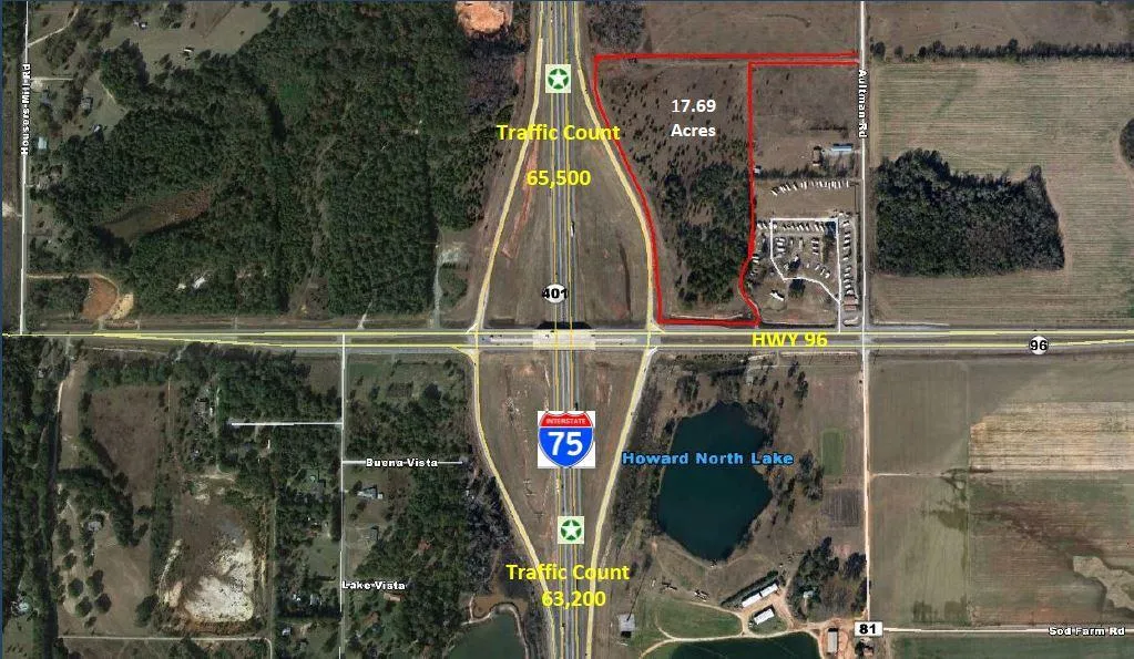 Great commercial development tract at the corner of Hwy 96 and Interstate 75. 17.69 acres offers plenty of room for many types of commercial development. Prime location with great visibility close proximity to shopping, restaurants and entertainment. Road frontage on I-75.
