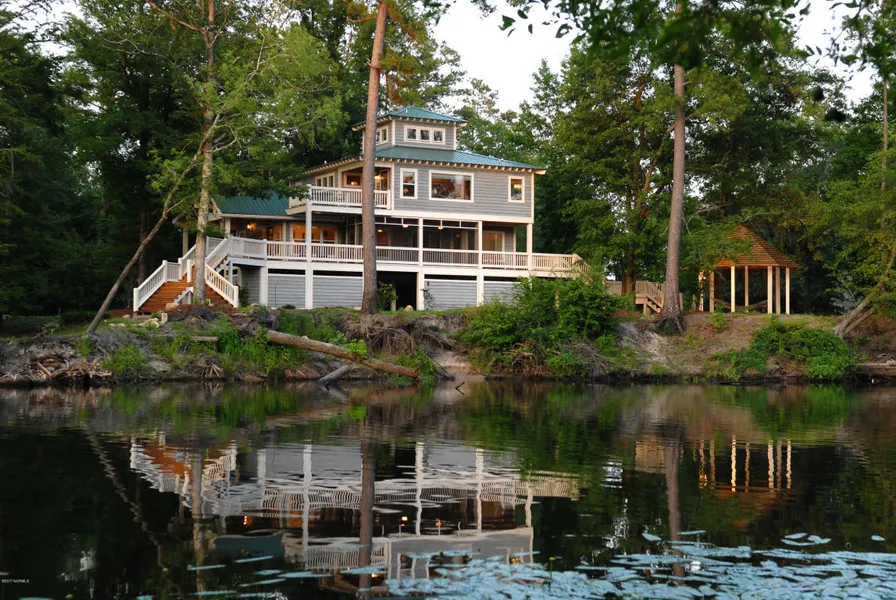 Riverfront executive retreat on bend in northeast Cape Fear River with all the bells and whistles, four bedrooms, three and one half baths, 15 x 7 balcony off Master Bedroom, Master bath with whirlpool tub and tile stall shower, 21 x 10 screened porch off Carolina room, solid surface counter tops in kitchen with breakfast bar, office area, reading nook 11x5, bookshelves and decorative walnut fireplace with imported italian marble, covered grilling porch 13 x 10, ceiling fans with lights, built on pilings with workshop/utility/storage room 22 x 11, plenty of covered area for boats, kayaks, canoes, boats, cars,etc, outside shower and outdoor gazebo and firepit for gatherings with family and friends on the river, pilings inground for barn shelter 30x24.Pender County water tap fee paid. Community boat ramp. Lot dimensions 205x216x207x286 (0.96 acre +/-). Also conveying is Lot 25 A-R PIN#3350...