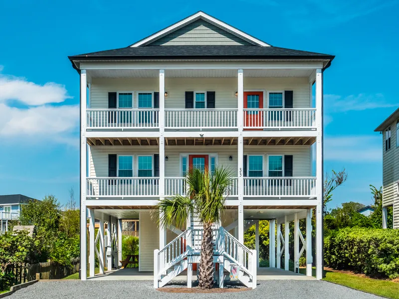 This recently completed custom home is now available in Sandy Ridge on Topsail Island. The details of this home are well thought through to include an elevator with dry weather entry. The location delivers sweeping views of the sound and ICWW from both living floors and rear decks. Dry weather parking could also be used for outdoor living. Plenty of parking for family and friends. This home is on a cul-de-sac making for additional privacy and minimal traffic. Tankless gas water heater provides for efficiency. Master on middle level in this reverse plan offers privacy. The living floor is open and the broad water views from the back deck and den area are stunning for this interior and protected property. The kitchen is large and the abundant counter space includes a bar seating area. Tile backsplash makes for a crisp look. Large pantry is very functional. White appliances accent the grani...