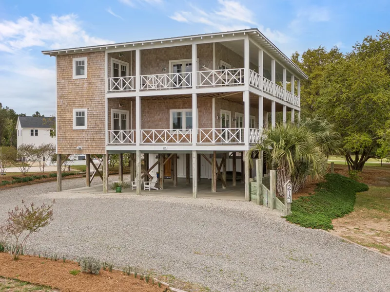 This meticulously designed, positioned, and constructed home was built to capture the optimal coastal living experience for either full time living or a weekend get away. As it is situated on an elevated lot out of the flood zone, it offers one of the best, if not the best views of the ICWW and the ocean from the mainland. This home features sweeping views of Lee Island, the ICCW, New Topsail Inlet and on to the ocean! Ocean views........that's correct. Prepare to be amazed. With the reversed and open floor plan nestled in the foliage and nearly an acre of space with mature Live Oaks, this house is positioned for an excellent blend of privacy as well as breath-taking views from both inside and outside on the expansive, top floor wrap around covered porch. Those porches also serve as quintessential living and entertainment space. Also located on this top floor are a spacious laundry room,...