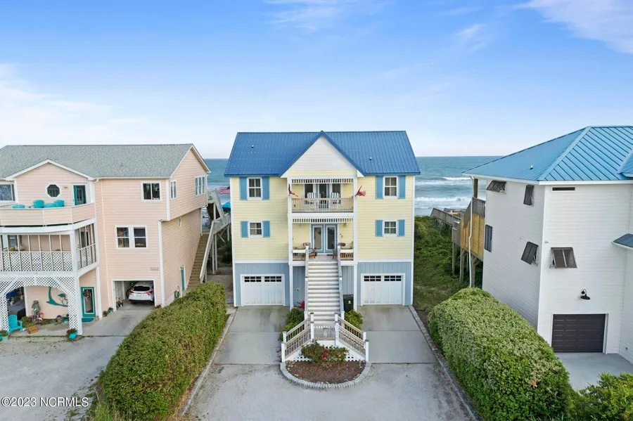 Nestled along the pristine shores of Surf City, this enchanting oceanfront home has been lovingly cared for by one owner. This idyllic 4-bed retreat, just 1-mile from Surf City, offers the perfect blend of coastal charm & comfort. With a brand new HVAC system, metal roof, new glass in the bedroom sliding doors, and recently updated exterior shingles, enjoy beach living without the hassle. Open your front door to a view of the ocean and an open floor plan with natural light pouring in through large windows, showcasing the beauty of the sea from every angle. Enjoy cooking meals in the large kitchen with butcher block island and entertaining on your private expansive deck. On the colder fall nights, sit by the stone fireplace in your living room or bedroom and breathe in the cool salty air. The bedrooms upstairs boast ample space, updated master bath, private bedroom balconies, and an upstairs coffee/wine bar to entertain friends and watch the 4th of July fireworks over the Intracoastal and ocean side. Retire to the spacious bedrooms where the rhythmic lull of the ocean ensures restful nights. The master suite features a private balcony for moonlit stargazing, a large walk-in closet, and a Jacuzzi tub with a large window to gaze out at the sea. In addition, the home was built to additional safety standards: not only was the home built when the codes about how deep the pilings had to be changed to a greater depth, they also added strapping, which you can see from the garage. In addition, the builder put two steel beams between the top floor and the main floor for added structural support. In lieu of storm windows, sellers have lightweight aluminum shutters for all beachside windows and doors as well as front doors and windows on the front second-floor deck. The wrap-around garage offers ample space for cars, golf carts or games. This home has so much to offer and is easy to show!