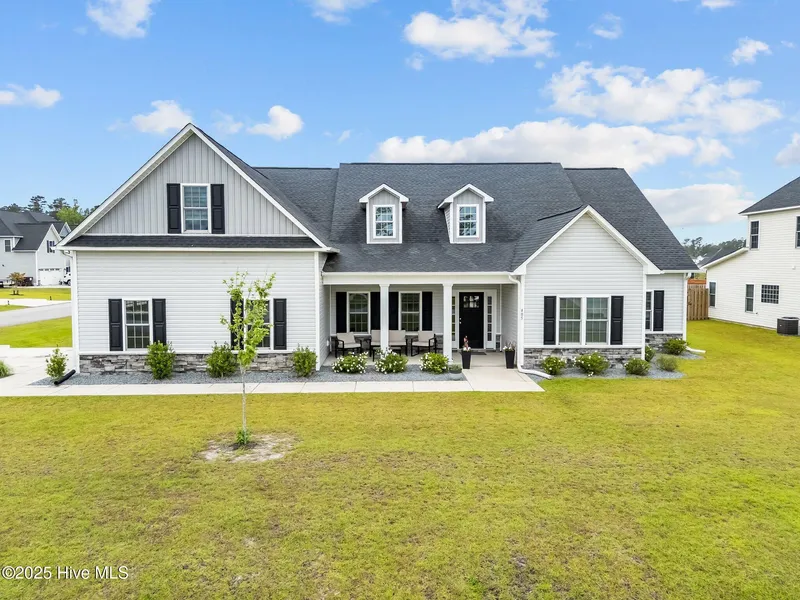 Built in 2022 and meticulously maintained, this like-new home sits on a spacious .42-acre corner lot in Rocky Point's Wylie Branch community. With 5 bedrooms, 4 full bathrooms, and 3,139 square feet of beautiful living space, this home provides room to live, work, and play-complete with a built-in basketball court. Inside, a wide foyer welcomes you into a bright, open layout featuring luxury vinyl plank flooring, crown molding, and a living room with a double tray ceiling and gas fireplace. The kitchen is a standout with granite counters, stainless steel appliances, a large island, a separate coffee bar, and a sunny breakfast nook that sets the stage for everything from weekday dinners to weekend brunches. Working from home≠ The formal office with French doors, wainscoting, and coffered ceiling makes it easy to focus. The first-floor primary suite includes private access to the back deck...