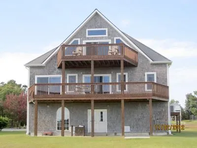 4 bedrooms, 3 baths, work island in kitchen is tiled and faces panoramic views of the ICWW and Topsail Island. Wood paneled office is located adjacent to living room. Oversized decking and exterior of home is wood cedar shakes. Large garages with full bath in garage area so you can shower after a day of yard work or boating. Wet bar in large suite on top floor with whirlpool tub, extra large bath area and deck off of room with water views galore.