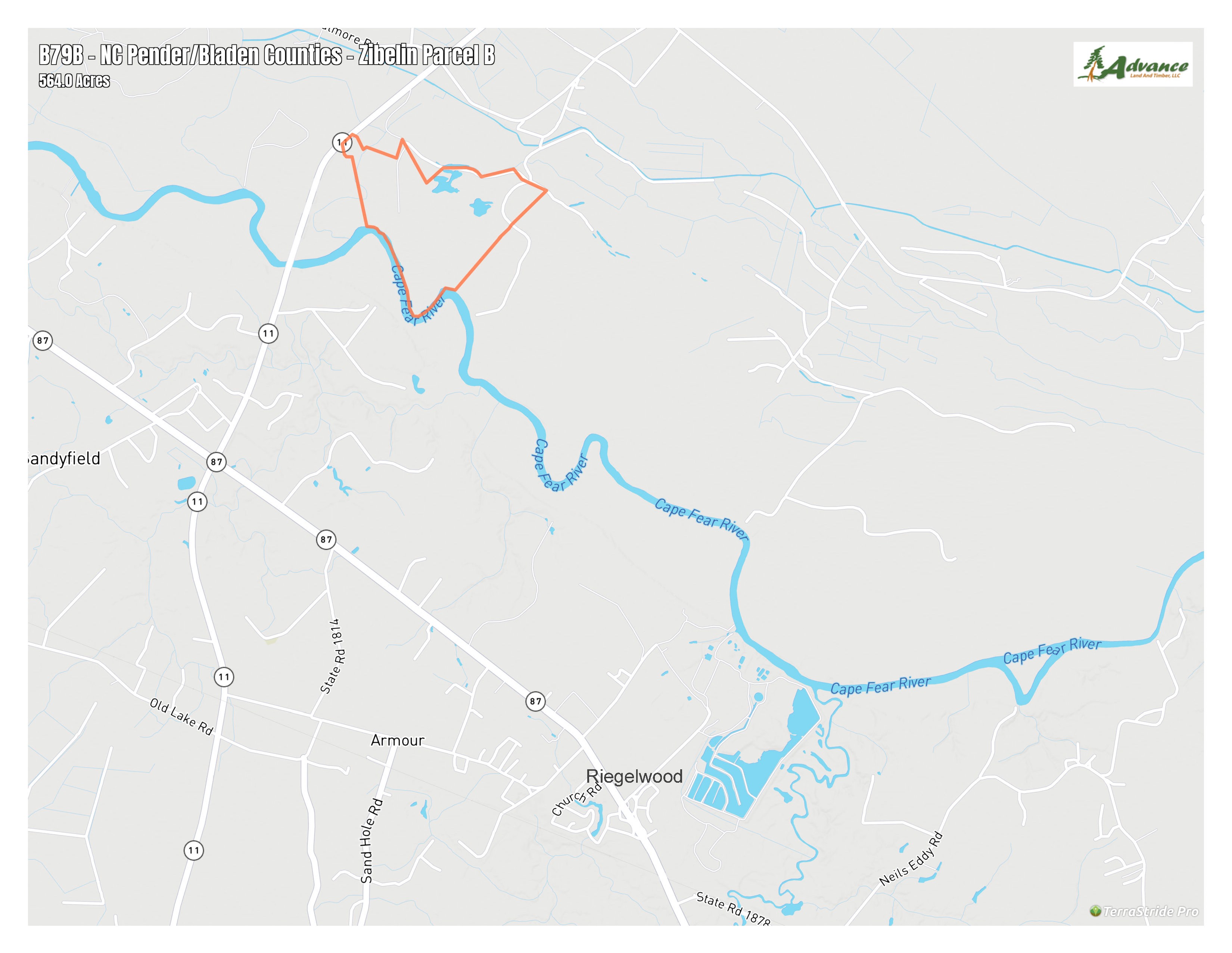 From Riegelwood, NC, travel northwest on Hwy 87. At the 4-way stop of the intersection with Hwy 11, turn right onto Hwy 11, referenced as General Howe Hwy. You will travel on Hwy 11 approximately 3 miles, with the parcel access being approximately 1 mile after your cross the Cape Fear River on the right (east).