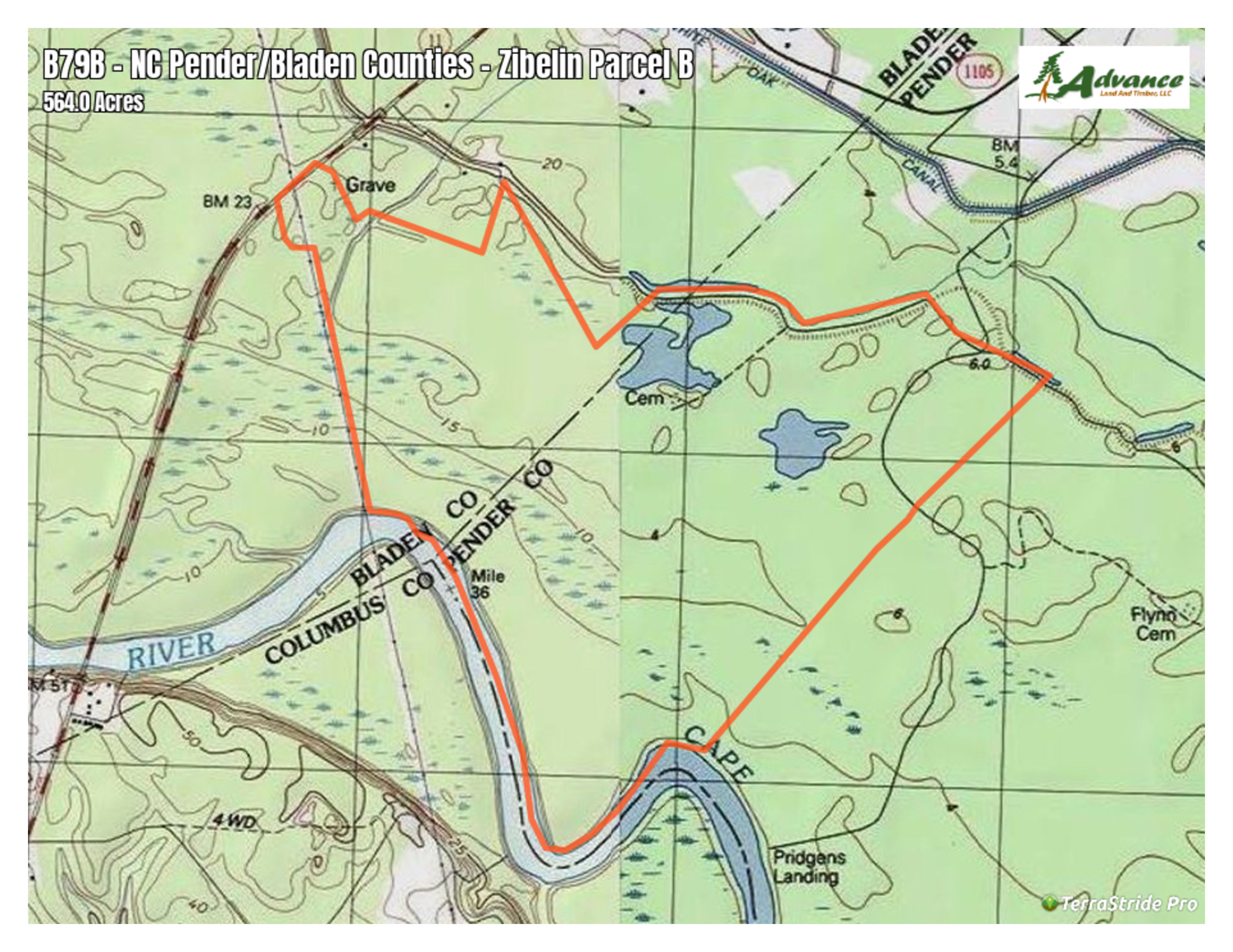 Parcel B has a total of 564 acres located off Hwy 11 in Bladen & Pender Counties, NC. This area is known for its tremendous duck hunting as well as bears, deer, turkey and hogs. There are two duck holes located on this property, one being close to 6 acres in size. This property boasts 1.25 miles of Cape Fear River frontage and has over 3.5 miles of internal roads allowing access to all corners of the property including a road that runs parallel with the river. This tract is very unique and has all of the qualities an outdoor enthusiast and timberland investor could want. There are 146 acres of planted loblolly pine plantations ranging from 60 years old to 15-year-old stands. It has 81 acres of 2004 longleaf pine plantation that is ready to be raked for pine straw and about 280 acres that consist of hardwood.