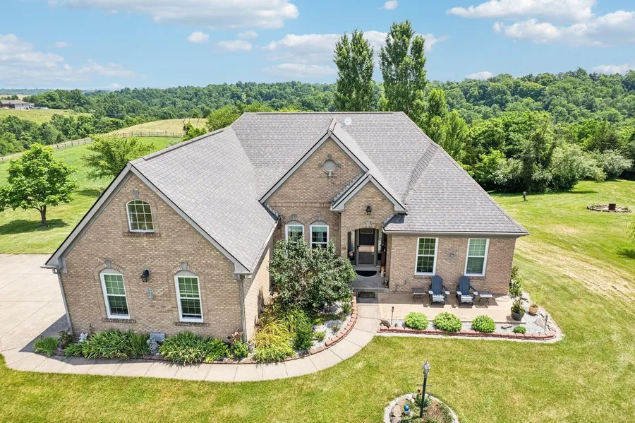 This custom-built brick-wrapped ranch on 13.6 acres offers a rare blend of privacy, functionality, and natural beauty—(30 miles from Cincinnati) Perfect for those seeking space to live, work, or play. The land is partially fenced with a mix of cleared & wooded acreage, ideal for hunting, gardening, ATV riding, shooting, and more. A massive 70x40 pole barn with concrete flooring & second-story loft storage makes it perfect for hobbyists or home-based business owners. Inside, the home features an open floor plan, hardwood floors, neutral decor, updated lighting, and a warm fireplace. The remodeled kitchen boasts solid surface countertops, tiled backsplash, and multiple bay windows. The owner's suite includes a dual vanity, separate shower, and a newer easy-entry jetted tub. Additional features include 1st floor laundry with stationary tub, private study, hidden loft room, finished walkout lower level with 2 bedrooms, full bath, workout & hobby rooms, storage, covered rear deck & large covered patio accessed by the walkout basement. May qualify for farm tax status.