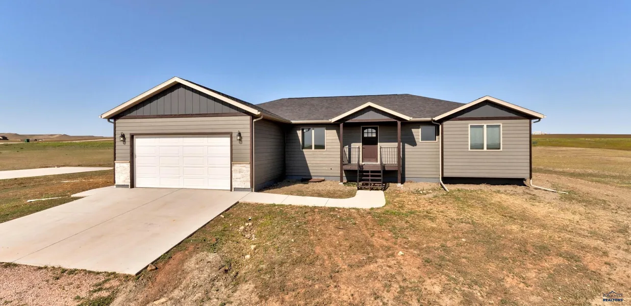 Are you looking for a great 5-acre home just 15 minutes from Ellsworth AFB and 20 minutes from Rapid City? Look no further! This unique property boasts FIVE bedrooms, 4 bathrooms, a beautiful covered back deck to watch the sunsets on, a 28'x48' concrete pad already poured & waiting for the shop of your dreams, and all on a quiet cul-de-sac! The main level includes the kitchen, laundry, living room w/gas fireplace, the primary suite with a large walk in closet and en suite bathroom with tiled shower, and two bedrooms on the other side of the home. Downstairs, there is a SECOND PRIMARY SUITE with jetted tub and large walk-in closet, & 1 bedroom and one office/work out room. The large family room in the basement is already plumbed for a wet bar/second kitchen to be added later. In-home speaker system in upper level. LVP, Granite counters, & new carpet in basement. Come see for yourself and envision your quiet oasis or the small homestead/hobby farm of your dreams. HOA allows horses/chickens and more!