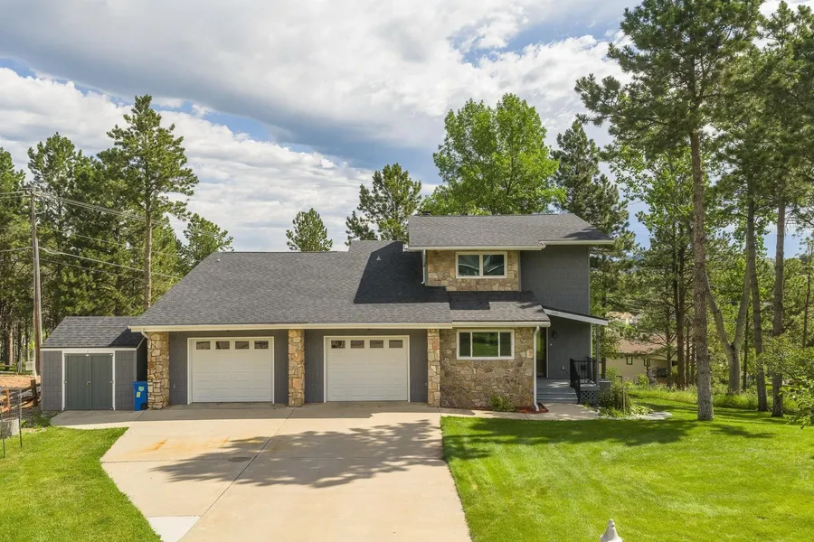 Listed by Elissa Erickson, KWBH, 605-877-4060. Nestled in a quiet cul-de-sac in the heart of west Rapid City, this custom home offers quality construction, a unique layout and optional secondary living space, all on a large tree covered lot! *The main level suits today's lifestyle and the unique layout allows for plenty of space for easy living and entertaining *Meal prep is made easy in the kitchen with stainless steel appliances, beautiful granite countertops and custom wood cabinetry *Unwind in the living room that is bursting with character- from the wall of windows that overlooks the back yard, to the corner fireplace with stacked stone surround, this is a great space to relax *Bonus den with half vaulted ceilings, large windows, a second fireplace and convenient wet bar *Main level primary suite has 2 closets, ensuite 4 piece bathroom and a fantastic bonus room with private deck access *Upstairs has 2 large bedrooms (each with two closets!), connected by a jack-and-jill bathroom *Loft area with great storage space overlooks the den *Basement set up for secondary living space, with separate secured access, 1 bedroom, 1 bathroom with walk in shower, living space, and a large multi-use room *Outside has an attached 2-car garage that is fully finished and has storage cabinetry *Enjoy the tree covered .57 acre lot from the large back deck, overlooking the well manicured yard maintained by a sprinkler system. Located near Canyon Lake Park, city bike path and local schools.