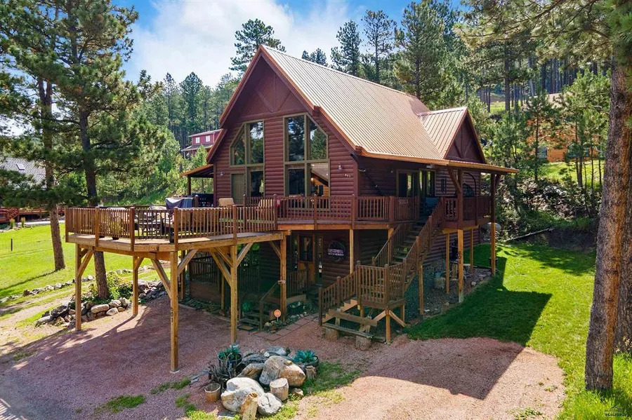 Welcome to your dream chalet in the heart of the Black Hills! Nestled just minutes from historic Keystone and boasting stunning views of the surrounding hills and iconic Mount Rushmore, this 3-bedroom, 2.5-bath home is a unique blend of rustic charm and modern comfort. With 3,356 sq. ft., of beautifully designed living space, this property offers the perfect Black Hills getaway or short-term rental investment—Airbnb eligible! The open concept main floor features soaring ceilings, a spacious great room with a cozy pellet stove, floor-to-ceiling windows that flood the space with natural light and breathtaking views, and luxury vinyl planking throughout. The heart of the home is the kitchen, complete with a one of a kind, handmade wood island, tile backsplash and stainless steel appliances including agas stove. A spacious main-level bedroom and full bath offers flexible living and finishes off the main floor. Upstairs, the loft-style oversized primary suite includes a half bath, walk-in closet, and a private balcony —a perfect sanctuary. The walkout lower level boasts a large family room, one bedroom, a full bath with jetted tub and separate walk-in shower with seat, laundry hookups, and a bonus room ideal for a music studio or home office. Outdoor living is encouraged with this home as one enjoys the wrap-around, partially covered porch that expands into a generous entertaining deck with sweeping views. Below, the oversized deck doubles as a two-car carport. This home also boasts a newer heat pump, central A/C, a new water heater, durable metal roof, RV parking, and a dedicated workshop/storage area. Don’t miss this rare Black Hills treasure—schedule your showing today!