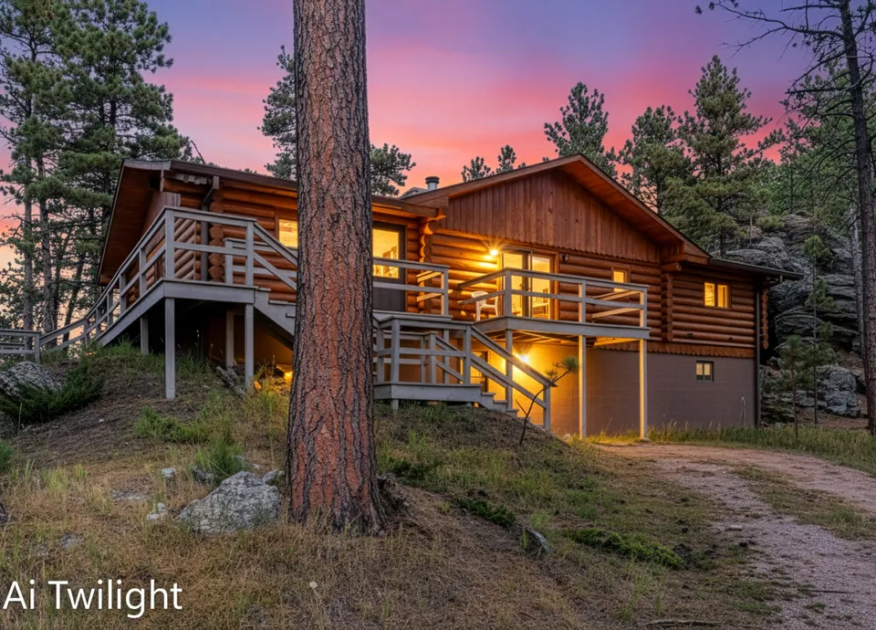 This genuine log cabin home is perfectly nestled among Ponderosa pines and granite rock outcroppings on over 10 acres, surrounded by the natural beauty of the Black Hills and bordered by hundreds of acres of USFS land. A log-beamed, vaulted ceiling highlights the sun-splashed great room with a stunning, floor-to-ceiling, two-sided wood-burning stone fireplace and new carpet throughout the main level. The efficient kitchen features a generous pantry, ample counter and cabinet space, newer stainless steel appliances, and a cozy dining area ideal for gathering with family and friends.