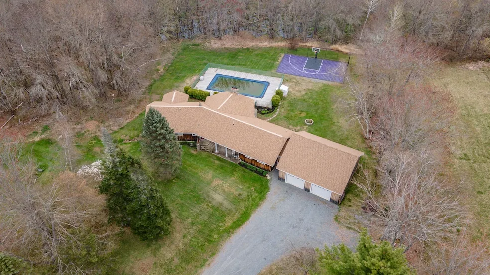 Awesome Custom Ranch Style Home With Acreage and Amenities! This one-of-a-kind ranch-style home offers comfort, space, and versatility set on generous acreage with standout features inside and out. The oversized garage includes a finished bonus room above perfect for guests, a studio, or recreation and a separate 400 sq. ft. heated workshop or home office offers flexible work-from-home or hobby space. The heart of the home is a beautiful white kitchen featuring leathered granite countertops, stainless steel appliances, an island for gathering, and an open flow to the sunken living room. There, you'll find soaring ceilings, a striking double-sided indoor-outdoor wood burning fireplace, and sliders that open to a private back patio. Outside, enjoy your own backyard retreat with a pool, basketball court, and distinctive stone and cedar board-and-batten siding that adds rustic charm and curb...