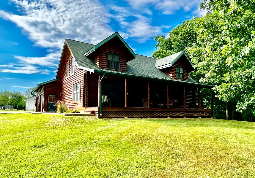 This beautiful custom-built log home sits on 24.09 acres. The cabin is 1.5 stories and has 3 bedrooms, 2.5 bathrooms, a full basement, a gorgeous open floor plan, and vaulted ceilings with big timber beams. You can enjoy every room for its amazing woodwork created by the Master Craftsmen who built this timber home. The spacious Primary Suite on the main level has a 16'x 11'6" bedroom with a big walk-in closet. The Primary Bathroom has your choice of a walk-in shower or a hot jet bathtub. The heated floor in the master bathroom makes it nice and cozy in the wintertime. Just inside from the 2-stall garage is the Mudd Room. It has a washer and dryer with a double entry 1/2 bathroom for convenience. The open kitchen with an island is furnished with a Jenn Air stove that has a cooktop grill, a refrigerator, a microwave, and a dishwasher. In the dining room, you have your choice of views. You can enjoy the rustic feel this cabin provides on the interior or look out into the backyard and enjoy the tranquil scenery. Maybe step outside the dining room to the covered porch where you can watch the soothing sunsets.