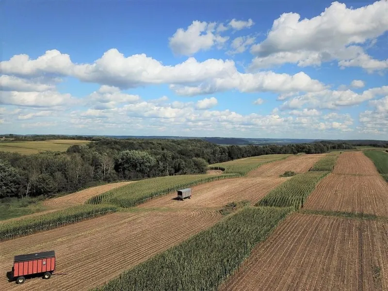 Pepin County ridge top farm with easy access from the west and south. 37 acres of high productivity tillable ground and a 28 acre hardwood valley. The work ground lies off Big Hill Road and Bluff Lane. The majority of the field is in nice straight rows with just a couple waterways. In terms of hunting, both sides of the valley are easily accessed from the top of ridge. This allows stand locations for just about any wind direction. Many large oak trees line the hill sides. The main draw leads straight down to the Tiffany Bottoms in an area where it is very difficult for the general public to access. Heavy trails lead up both sides of the valley from the expansive river bottom to the crop fields on top of the ridge. This parcel ties into thousands of acres of wooded ridges and nearly connects to several other large valleys to the west and south. There is a nice hill road providing atv access from the top of the ridge to the bottom. This property lies about 4 miles northeast of the city of Pepin within view of the Chippewa River.