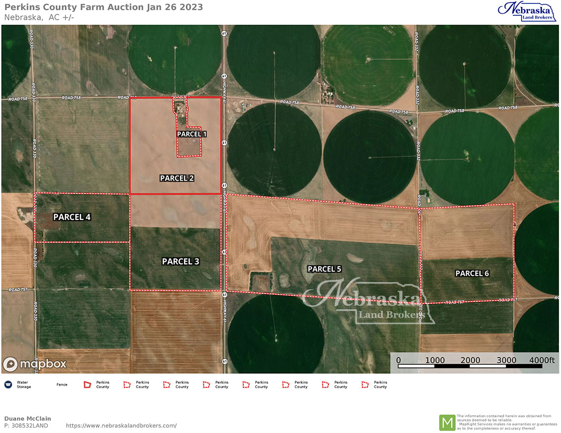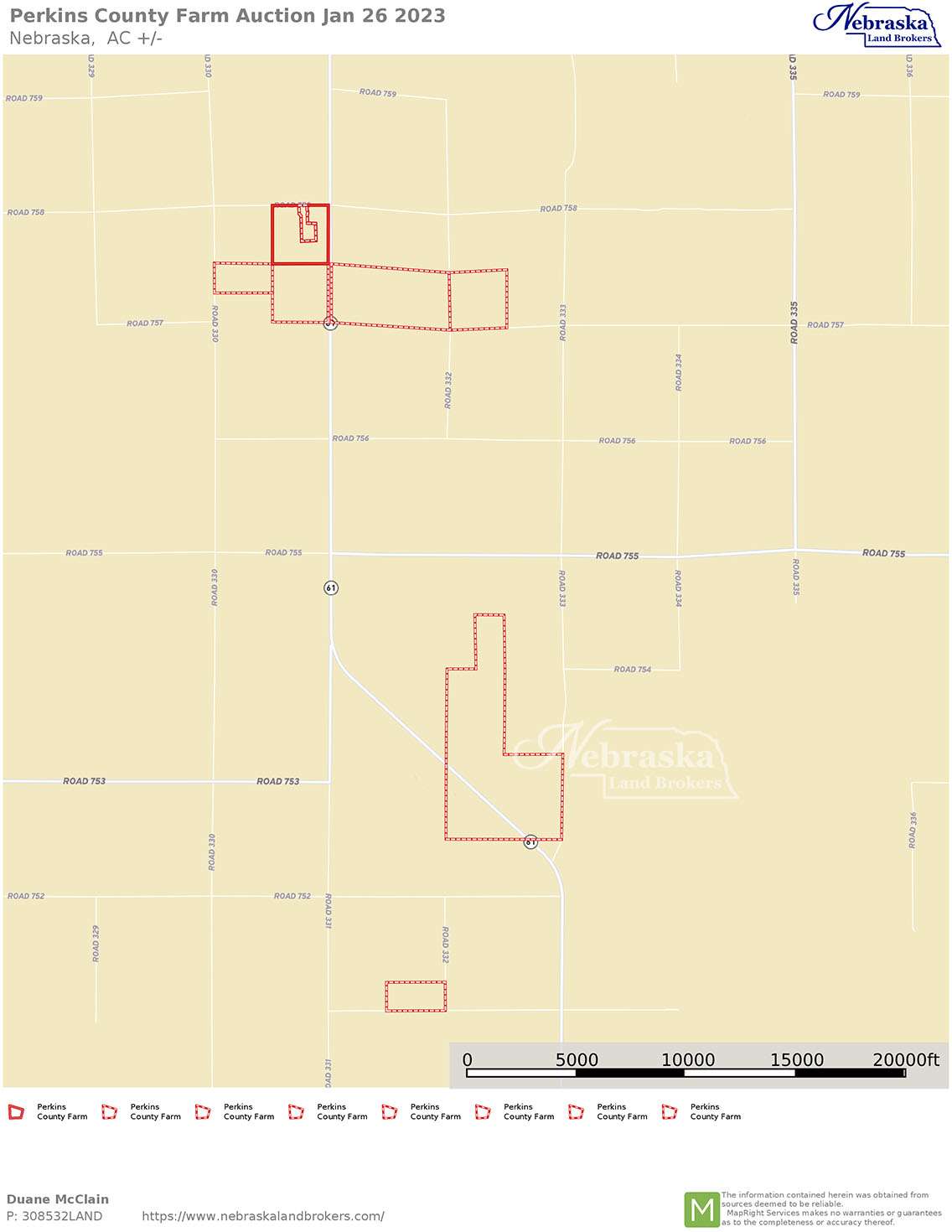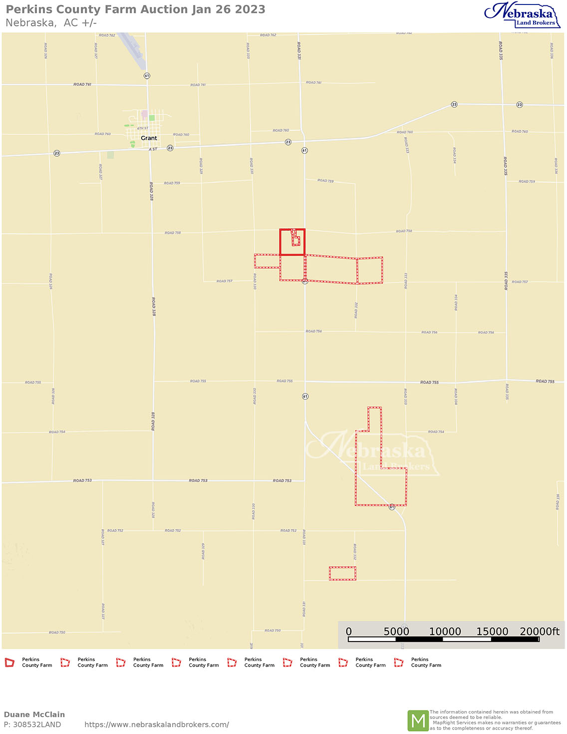 Nearly all of the cropland is located about 4 miles southeast of Grant NE along Highway 61. A 17 acre building site will be offered as a separate Parcel. The 777 acres of grass pasture is located 11 miles south of Grant on both sides of Highway 61.