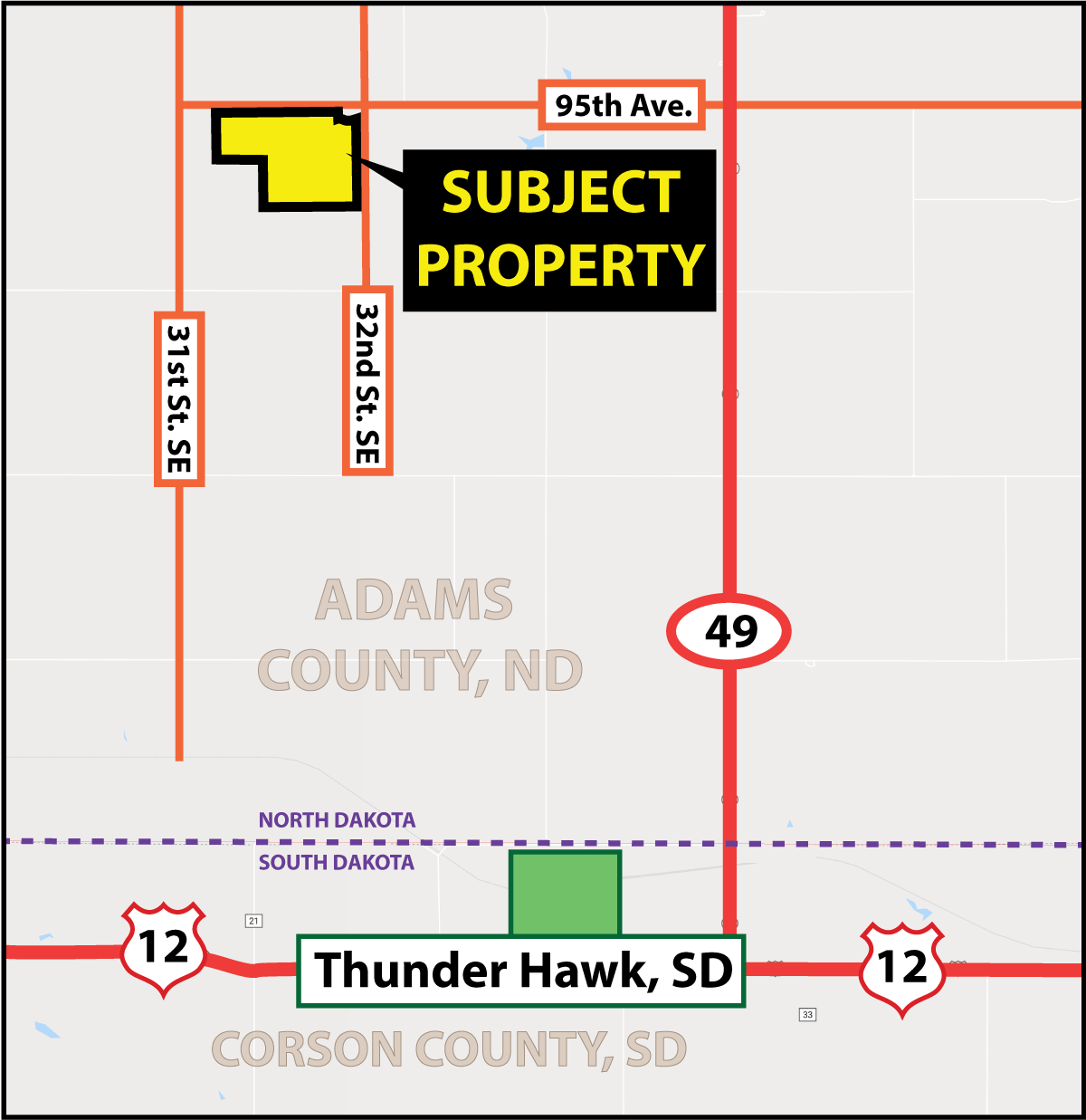 From the intersection of Hwy #12 and Hwy #49 east of Thunder Hawk, SD: Drive approximately 4 miles north on Hwy #49 and turn west on 98th Street SW. Go two miles west to reach the northeast corner of the property.