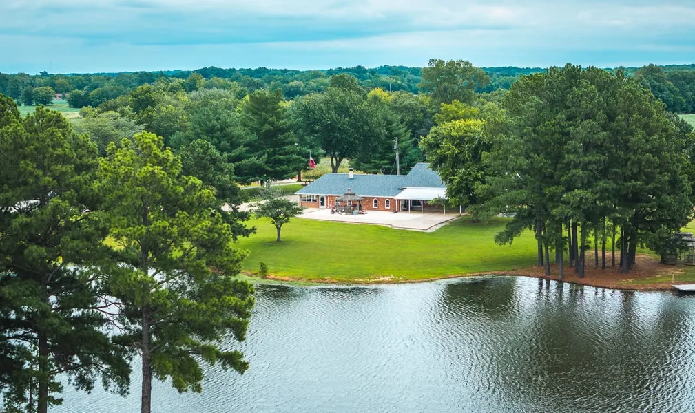 The home’s open floor plan and enclosed covered porch are perfect for entertaining, while large windows throughout provide breathtaking views of the 6-acre stocked lake. Inside, tile floors span the entire home, with the spacious master suite featuring walk-in closets and a luxurious steam room.