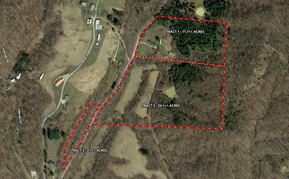 OPPORTUNITY KNOCKS w/this exceptional offering of real-estate. Selling to the highest bidder, totaling 38 +/- acres being offered in 3 (three) tracts. TRACT 1: approx. 11.7 +/- acres of wooded and open ground and road frontage. Features a 1278 sq. ft. home w/2 bedrooms-2bath-kitchen-dining area-sitting room-great room-attached garage-forced air gas furnace & air conditioning. 2 gas log fireplaces, located in the dining area and great room. The home also features a Sunroom overlooking the backyard. Large enough for recreation & hunting. Also featuring an 1120 sq. ft. Pole Building, a 14 x 90 Winner House Trailer with 3 bedroom-1 bath-Living room- kitchen/dining area. This trailer offers income potential or a mother-in-law suite. TRACT 2: Approx. 24.1 +/- ACRES, Consisting of Tillable ground-Pond-Woods & road frontage. Potential for Recreation-hunting-Maturing Woods and undergrowth for deer-turkey and other wildlife with plenty of signs of white-tail on this tract. TRACT 3: Offers a smaller tract consisting of 2.12 +/- Acres of wooded land with full road frontage. The small tract is adjacent to tracts 1 & 2, located on the opposite side of the County Road.