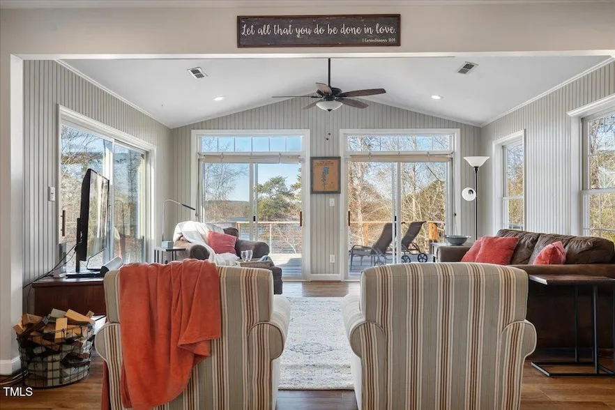 Nestled down a winding, tree-lined, and secluded road with over 3 acres of land is this stunning waterfront Lakehouse, offering privacy, serenity, and untouched natural beauty. The SonShine Cove sits just above the serene shoreline of Mayo Lake creating the perfect blend of rural charm and modern comforts. With windows throughout, nearly every room boasts breathtaking views of the sparkling water, providing a natural atmosphere that feels like an endless vacation. Here at the SonShine Cove you can enjoy your morning coffee on the expansive 590sqft deck as you watch the sunrise over the lake, or unwind in the evening amidst family and friends roasting s'mores by the firepit. Lay on the grass and stargaze in the evenings, or play tag with your grandkids under the mature pine trees. The bilevel floor plan includes 4 bedrooms, 3 full baths, and a large downstairs Rec Room, perfect for billiards, board games, video games, or hanging out. Many aspects of the house were updated in 2017, including Luxury vinyl plank flooring, neutral paint throughout, and granite kitchen countertops. A new heat pump was installed in 2023, and the exterior just had a powerwash. The property also recently had an upgraded septic system installed to accommodate 4 total bedrooms. At the edge of the lake lies an adjacent floating dock leading to a quiet and discreet cove where the creatures of nature are your closest company. If you enjoy hunting, Mayo Game Lands offers 4,204 acres in Person County for year around recreation. Common species that can be found in this region include waterfowl, deer, foxes, turkey, quail, raccoons, and rabbits. When you're ready to leave your tranquil Lakehouse retreat and enjoy some social time, just 3 miles away is Mayo Lake Park, with a generous 120 acres of community walking trails, playgrounds, fishing, disc golf, paddleboarding, canoeing, kayaking, RV Campsites, restrooms/showers, and a fantastic boat launch. The property includes picnic shelters and a pavilion that hosts summer movies in the park and various live bands. The space is even rentable for family reunions, weddings, and more. DT Roxboro, only 13 miles south, offers restaurants, breweries, a theatre, and smalltown charm. A quick drive beyond DT Roxboro is Palace Pointe, an entertainment venue with a bowling alley, roller skating rink, billiards tavern, Dragon Arcade Den, movie theatre, axe throwing and the world's only authorized Gel Blasting Arena. Tunnel Creek Vineyards is only 12 miles away, and encompasses an award-winning wedding venue and wine tasting facility with spectacular views of the surrounding area. A bit further out, you will love the VA Intl Raceway, just 35mins away, offering world class road racing circuits and events for fans throughout the year. The VIR is known as America's first 'Motorsport Resort' offering skeet shooting, karting, rifle range, lodging and on-site restaurants. Another short drive westbound offers Caesars Virginia Casino and Convention Center, located in historic Danville, VA. This resort style destination offers world class dining, hotel, lounges, upscale bars, a relaxing spa, hot roman pool, and entertainment throughout the year. A full-service sportsbook with 5 betting windows and 21 kiosks (for those aged 21 and older) is one of the highlights of Caesars VA. Not only is this unique property the perfect location for enjoying some occasional night life and recreational activities, but it's a rare opportunity to see beyond the daily grind and consider how it could even be utilized as a vacation rental for potential passive income. The house is being offered fully furnished, making it perfectly turn-key and convenient to create quick cashflow. Similar properties in the area lease short term between $200-$400/nt. Whether you're longing to boat, fish, play, sunbathe on the floating dock, or invest in new opportunities, this property is an outdoor lover's paradise that blends recreation with relaxation.