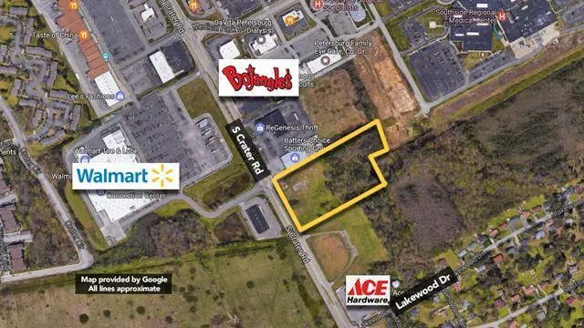 Auction Starts: 9:00 AM 1/22/2017 Auction Ends: 12:30 PM 1/26/2017 Nominal Opening Bid: SELLS WITHOUT RESERVE. 5.3+/- ac development site zoned B2. Property has frontage and signalized entrance on South Crater Road located across from Walmart. Property can be used for retail, restaurant or an office. Other retailers in the area include Wawa, Martin's, Walgreens, Wells Fargo. Quick Close Available. Buyer can save title/closing costs by paying in full (including any buyer paid fees) on day of sale. See property specific Disclosures for details. Note: A Buyer's Premium (Buyer's Fee in WI) will apply for this property. Please see Terms of Sale for details. Broker Licenses: VA Pamela L. McKissick RE LIC 0225218640; Williams & Williams RE LIC 0226 023368