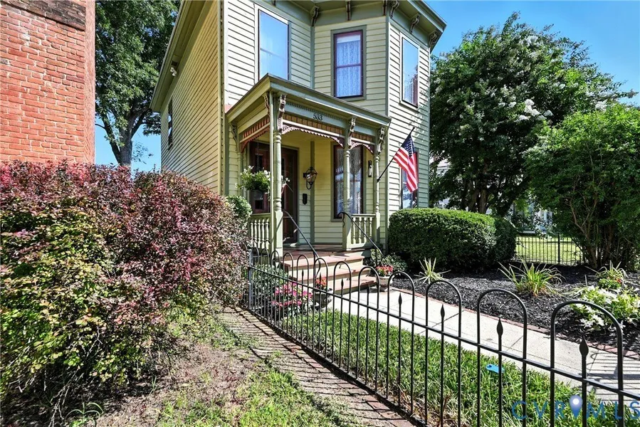Step into timeless elegance with this fully restored and move-in ready Victorian Italianate, circa 1899, nestled in the heart of the High Street Historic District. Boasting 2,058 square feet, this architectural gem features heart pine floors, soaring 11-foot ceilings, arched and columned doorways, intricate gingerbread trim, and four fireplaces adorned with exquisite chandeliers and plaster medallions. The home offers two spacious bedrooms plus a second-floor office or potential third bedroom. Enjoy the ambiance of stunning gas lamps on both the front and rear porches, and a beautifully painted exterior and interior. The kitchen is equipped with hard surface countertops, stainless steel appliances, and a brand-new washer and dryer. Recent upgrades include a dual-zone HVAC system, ensuring comfort year-round. Outdoors, a charming wrought iron fence encloses a private courtyard, complemented by an outbuilding and rear access and parking for multiple vehicles. Just steps from local restaurants and nightlife along a tree-lined street and conveniently located 10 minutes from Fort Lee and 25 minutes from downtown Richmond, this historic treasure offers modern comfort with classic charm.
