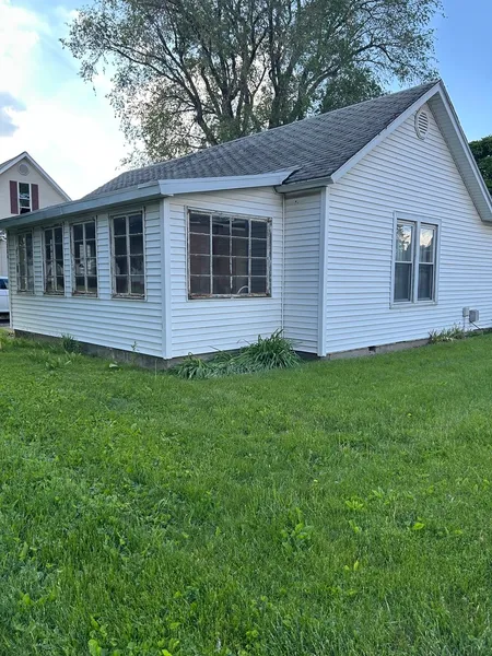 Potential abounds with this 3 bdr 1 bath home centrally located in small town America. Large south facing sun porch welcomes you as you enter the home. Large living room, functional kitchen with appliances. Utility room for washer/ dryer. Bedrooms have built ins for great storage. Currently the third bedroom is being used as a dining area. Large three season room in rear of house that attaches to a work room and garage. Garage space for a lawn mower off the rear of garage, with it's own overhead door. Large lot with alley access. Seller needs to sell "as is", so bring your offer and tools.