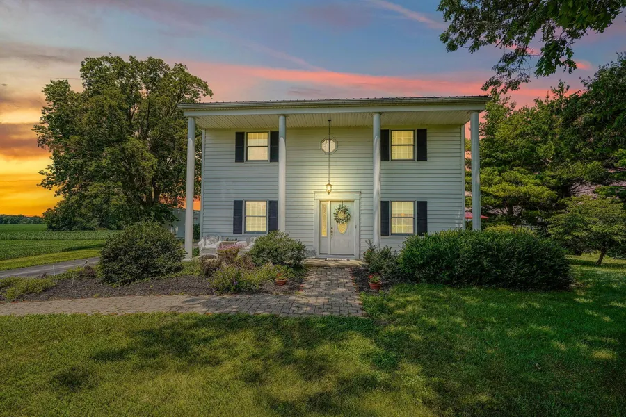Perched high on a hill down a long private lane, this custom-built traditional home blends timeless design with thoughtful updates, offering both privacy and panoramic views across 3.5 rolling acres (two parcels, 2.3 and 1.231 acres). Built in 1975 by the original owners and meticulously maintained ever since, this 1,936 sq ft residence radiates quality craftsmanship and care. Step inside to find a bright and inviting open kitchen featuring a generous island with seating, stainless steel appliances, and abundant cabinetry-all oriented to capture sweeping views of the surrounding fields and skies. The adjacent family room is anchored by a custom wood-burning fireplace, framed with elegant millwork, and enhanced by expansive windows and integrated lighting that create a warm, welcoming atmosphere. The home offers thoughtful updates throughout, blending modern convenience with classic character: refreshed flooring, upgraded fixtures, and carefully curated finishes preserve its original charm while elevating everyday living. Outdoors, you'll discover a spacious patio perfect for entertaining, morning coffee, or quiet evenings under the stars. Additional highlights include a partial basement with crawl space, a detached three-car garage, and mature landscaping that enhances the property's natural beauty. This is more than just a home-it's a peaceful retreat, custom-built for comfort, surrounded by space to breathe and room to dream.