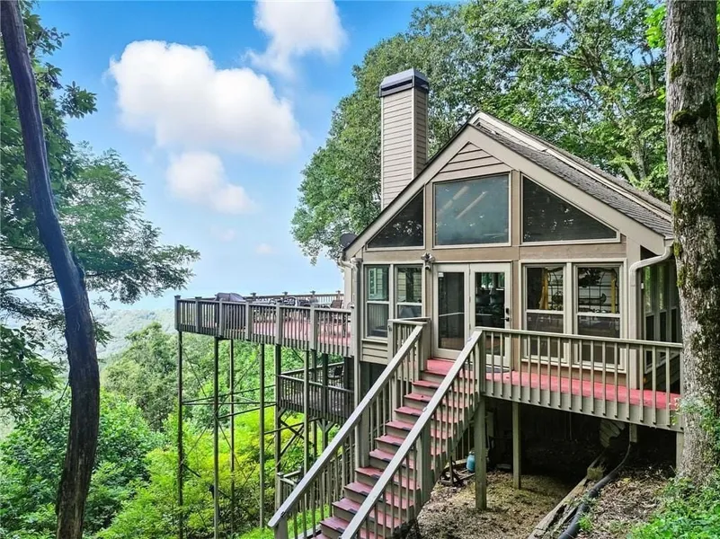 THAT VIEW . . . This perfect mountain cabin sits at over 3000 feet providing incredible long range mountain views all the way to the ATLANTA SKYLINE! Being sold with its functioning hot tub and FULLY FURNISHED it is already a consistently booked & financially performing short term vacation rental ready for its next host. Or make it your own dream mountain cabin home! Enjoy the cozy living room with mountain views or sit down for a meal in the stunning sun room. The oversized Primary Bedroom sits on the main level and includes walls of windows with mountain views and tremendous natural light. It also has its own sitting room with wood burning stove, spa like bathroom with double vanities, glass walled shower, and soaking tub. The remaining floor plan includes a loft style game room with sleeping quarters, 2 bedrooms and full bathroom on the lower level, and a massive laundry room. Locate...