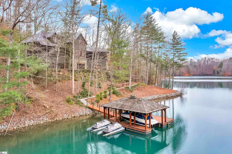 A one of a kind custom mountain-lake retreat designed by renowned architect, Keith Summerour. The moment you enter the private drive you feel a sense of calmness and relaxation. A drive thru garage and pea gravel courtyard greet you upon arrival. The slate roof, wavy edge siding, copper gutters and natural stone are the perfect combination of rustic-elegant style. Perched upon one of the most rewarding locations in The Reserve, this lakefront masterpiece is located in a quiet, deepwater cove and enjoys sweeping lake and mountain views opposite a protected island. This 5 bedroom, 5.5 bath home is designed to have a open airy feel to compliment the rustic detailsâ??reclaimed pine floors, solid mahogany doors, mahogany casement windows, high ceilings, custom kitchen with granite countertops and large island, Wolf range and dual sub-zero refrigerators, open spaces, and spacious places to gather indoors and out creates a welcoming place to retreat for some relaxation, or entertain family and friends! The master bedroom has its very own "sleeping porch" along with a private office tucked away. The bathroom features dual vanities, heated floors, a custom walk-in closet and a large soaking tub. The home easily sleeps 25 people. A separate guest house offers a cozy getaway for guests who prefer a little more privacy. The outdoor porches provide ample entertaining space with a large masonry fireplace to gather around. The home is fully furnished and awaiting new owners to make a lifetime of memories. This homesite has 384 feet of rip rapped shoreline, a private sandy beach, and Reserve standard quality dock with boat lift and 2 jet ski ports. Premier membership $60,000 required with purchase.