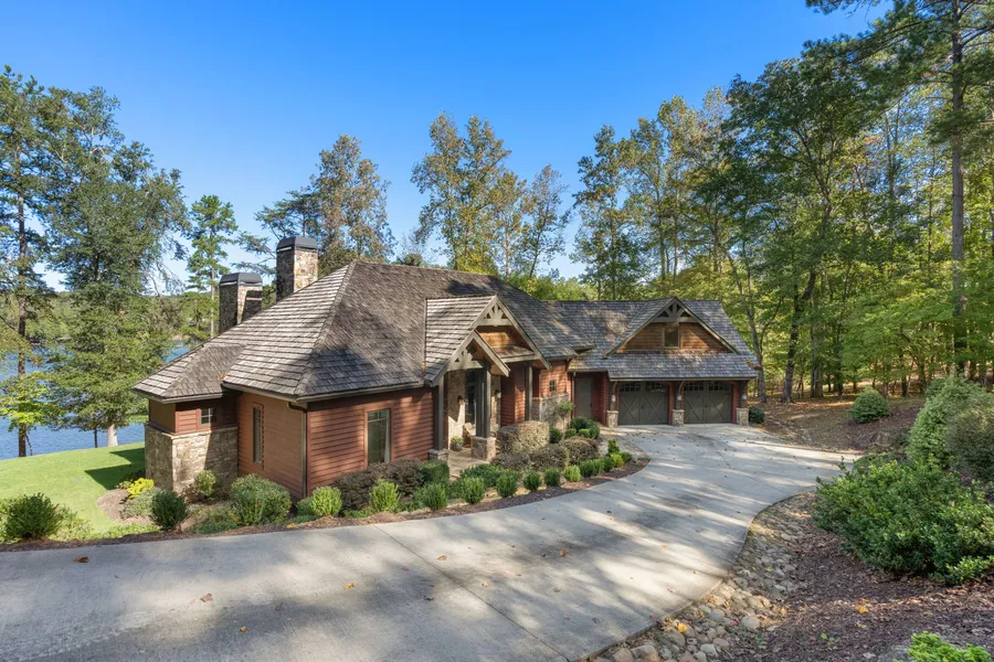 Situated on a flat waterfront lot framed by mature trees and sandy beach shoreline, this property showcases a serene natural setting with effortless access to the covered dock. With 265' of lake frontage, this setting is truly spectacular. From the moment you arrive, the arched glass entry framed in rich wood makes a strong first impression and sets the tone for the style and craftsmanship inside. The great room features vaulted beamed ceilings, a stone fireplace, and a wall of glass with sliding doors that open to the covered porch, showcasing lake views and seamless indoor-outdoor living and creating a remarkable gathering space. The arched transom windows mirror the timbered architecture beyond. Every element of this home speaks to refined mountain lake luxury. The gourmet kitchen combines elegance with function. A striking stone farmhouse sink, custom cabinetry, and premium appliance...