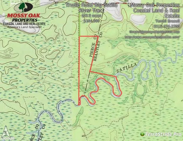 Hard to find 104 acre property on the Satilla River in Pierce County, GA. This mixed use recreational, timberland Tract has 1.3 Miles of Frontage on the River and Merchantable Timber. Excellent whitetail deer, turkey, waterfowl, and hog hunting on this property. Over a Mile of Satilla river freshwater fishing and other water sports activities. Unrivaled in the region duck and small game hunting. All of the timber is merchantable with a substantial value in both Planted Pine and Hardwood. Located South East of Patterson and North of Nahunta and East of Blackshear, GA this property is and easy drive from Brunswick, GA or Jacksonville FL. All water rights, mineral rights, oil and gas rights are included with the property. Property features a Deed Access Easement and has power within a reasonable distance. Contact Terrell Brazell with Mossy Oak Properties for more information on this property and others like it at 912-674-2700.
