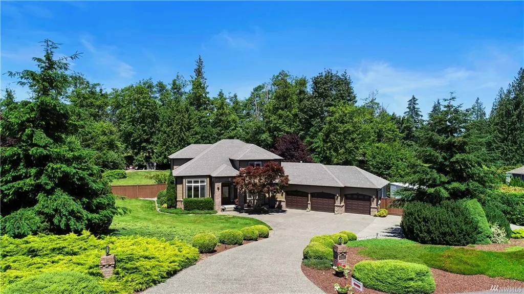 Beautiful Custom home on 1+ acre in quiet, gated community of Wildview Ridge. Fenced, park-like yard with lighted Multi-Sport Court. Great Room features home theater with HD projector TV & retractable screen. Recently upgraded stainless appliances w/ gas JennAir cook top & built in convection-microwave & oven. Perfect work from home office with dbl set of french doors, custom built-in cabinets, book cases & 2 work stations. Master Suite with fireplace and picture window overlooking the yard & pastures beyond. 5 piece bath with vanity, shower, soaker tub, large walk-in closet. Huge 3 car garage. Partial view of Mt Rainier from back yard. RV Parking behind gate, and circular driveway. Gas connect for BBQ. 2 storage sheds.