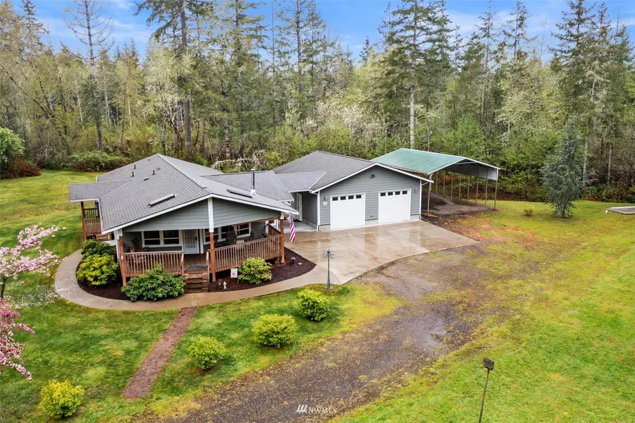 Home Sweet Home nestled on 2.5 acres of lush grounds & privacy! Custom-built in 2010 (2x6 construction), this lovely 1620 sq. ft. rambler lives large with an open-concept floorplan, vaulted ceilings, extensive covered porch, lots of windows, & plenty of can lighting throughout. Enjoy 3 bedrooms, 1.75 bath, including a primary bed/bath combination with lots of closet space, a finished & heated flex room in the detached 2-car oversized garage, covered RV storage, an RV pad with 30 & 50 amp power, & private well. Gorgeous grounds with a gated driveway lead to a secluded oasis away from the hustle & bustle. A heat pump/AC keeps things cozy on chilly Pacific Northwest days & cool on the hot ones. A peaceful, serene, & picturesque gem awaits.