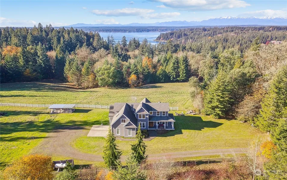 Once in a lifetime opportunity to own a truly breathtaking custom-built cedar home with the privacy and tranquility of nearly 19 Fully fenced acres with gated entry. This home boasts a great room with vaulted ceilings, fireplace and beautiful hardwoods floors. Fully remodeled gourmet kitchen with quartz countertops, SS appliances and coffee bar. Main floor primary bedroom with ensuite & spacious walk-in closet. Wrap around porch and expansive backyard patio is perfect for all your outdoor entertainment needs. RV/boat parking, built-in back up generator, and views of Vaughn Bay and Olympic Mountains. Exquisite walking/riding trails throughout the property yield endless activities. Don't miss this chance to own your own slice of paradise!