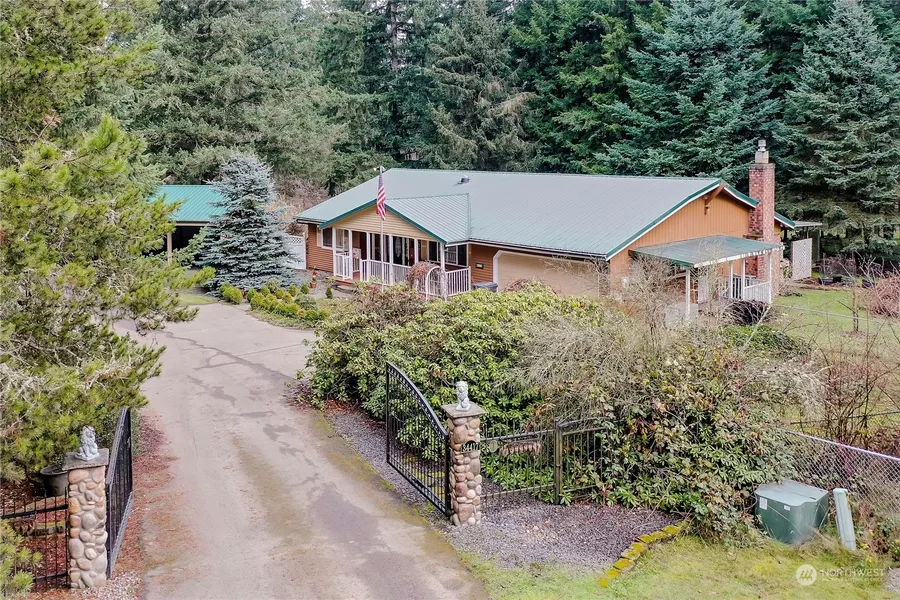 Open the gate and find your 5-acre slice of the Pacific Northwest. Rambler home in Roy has 3 beds, including primary suite with built-in vanity, 2 baths, formal living and dining areas, and a family room with a gas fireplace and extra-large sliding doors leading to one of several covered porches. The kitchen has granite countertops, a center-island range, desk area, and a breakfast bar. The property features a large shop with lift, overhead crane, wood stove, propane, fans, woodworking shop, and office. The property includes grow tunnels, two chicken houses, ample parking and is fully fenced. With two electric meters, Kennitco Water system, heat pump, generator, metal roofs, and fruit trees, it's a haven of comfort and self-sufficiency.