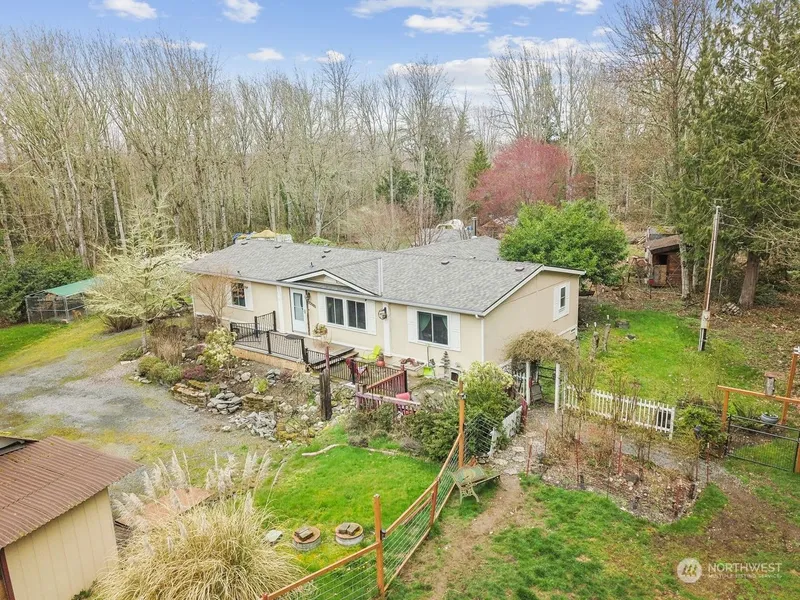 Come enjoy your peaceful and private triple-wide Manufactured home, 1880 sq ft on 3.38 acres. New furnace and New Trane Heat pump, Newer windows, and New roof with Leafguard gutters. An inviting front deck leads into a cozy living room with a wood fireplace for cold winter nights. The kitchen offers ample cabinet space, an island for food prep, and an adjoining dining space for gatherings. The primary bedroom has an extra large walk-in closet and bathroom, while the two additional bedrooms have a shared bathroom. Head out to your spacious deck and view the mature fruit trees, gardens and 12x12 gazebo. Walk along the walking path to your 4 out-buildings with plenty of storage. Great local schools, Weyerhaeuser elementary 2.3 miles away.