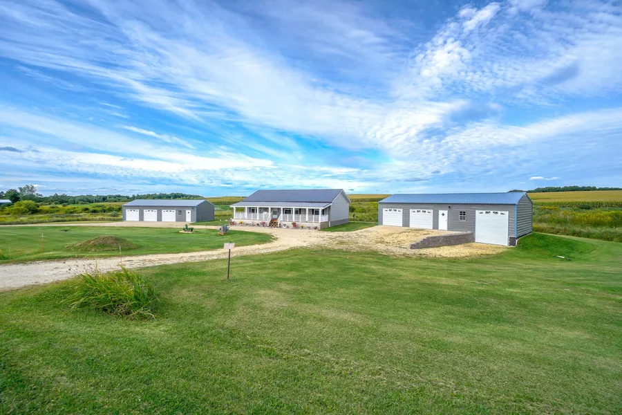 This unique prairie style home offers expansive vista views from a sprawling front porch and every wellplaced window. Set on 9.9 acres, the gently rolling prairie views appear endless. A well designedopen floor plan provides convenient one level living. Three bedrooms and two baths, with aspacious kitchen, are all nicely updated with excellent fit and finish. Largely maintenance free on theexterior, including metal roofs, the home is flanked by two large outbuildings. Thoughtfully designed tomatch the style of the prairie home, these buildings provide over six car access, with plenty of roomfor your favorite hobby or home based business.