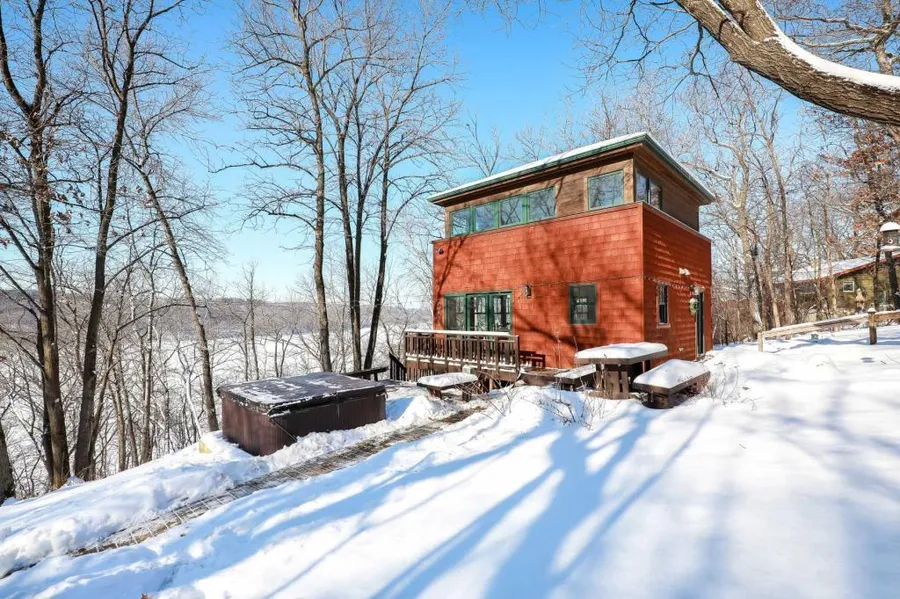 Nicknamed the "treehouse" this home is a perfect weekend getaway or everyday retreat! Floor to ceiling windows throughout offer truly breathtaking panoramic views up, down and across river. Recent updates include kitchen appliances, granite countertops (kitchen and baths), kitchen backsplash, hardware, and light fixtures throughout. The home has a private tram to access the river. Truly a one-of-a-kind property with 223ft of St. Croix River frontage. Just 10 minutes south of Hudson and 5 minutes north of Kinnickinnic State Park and River (class 1 trout stream).