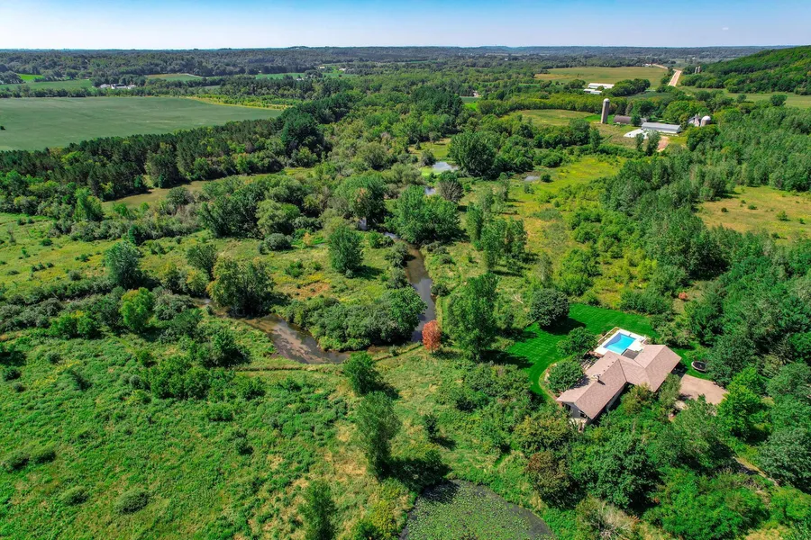 An absolutely stunning estate awaits you sitting on almost 58 acres with the Kinnickinnic River running through it! This custom-built prairie style home design inspired by Frank Lloyd Wright is truly one of a kind and selectively designed to conform with nature to offer relaxing spaces throughout, while boasting panoramic views of the beautiful Western Wisconsin countryside. This retreat-like home offers an abundance of natural lighting, from the unique open concept main level with a great owner's suite and screen porch, to the lower level theater room, to the pool outside, to the banks of the river to Trout fish, the entertaining options are endless. Outside you'll find the river side two tiered deck, in-ground heated pool and spa, irrigation system and beautifully manicured lawn. Brand new roof & boiler system. Just minutes to I94 and 30 minutes to the Twin Cities this opportunity is a rare find!