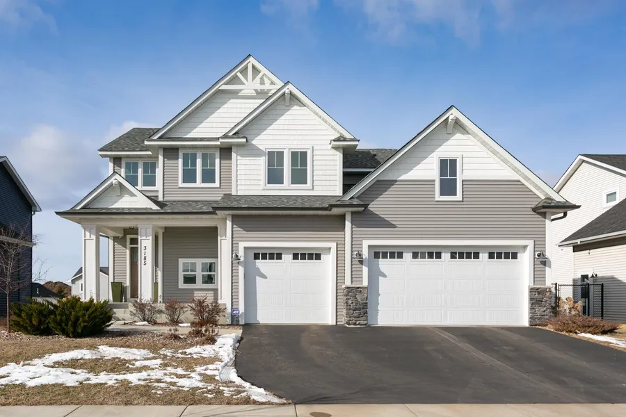 Beautiful like-new home in Sterling Ponds with many excellent upgrades! Upon entering, be welcomed into the spacious open concept kitchen, living, and dining areas, with natural light streaming through large windows. A gas fireplace complements the seating area, and the adjacent kitchen is well appointed: quartz counters, large island, stainless appliances, gas stove, and generous cupboard space. A walk-in pantry offers tons of storage. The mudroom around the corner has plenty of space to drop things and store things, too. An extra-height sliding glass door leads from the dining room to the deck, with steps down to the fully fenced yard. Upstairs, enjoy the convenience of 4 bedrooms on one level and 2nd floor laundry. The main bath features two sinks, as does the primary ensuite, which also features a tile shower. A tray ceiling graces the primary bedroom, for a touch of elegance. The unfinished lower level is roughed in for a future bath, and feels extra spacious with high ceilings and large lookout windows. 8-foot high doors on the 3-car garage accommodate larger vehicles. Located just down the block from a park, and a new daycare center is opening soon, right in the neighborhood! Driveway seal coated 2024. Fence stained 2024; deck stained 2023. New furnace 2023.